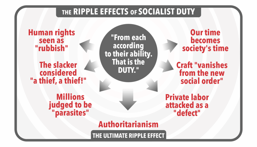 Learn the details in "The Ripple Effects of Socialist Duty" (also summarized in Ch. 2 of Socialism Says).