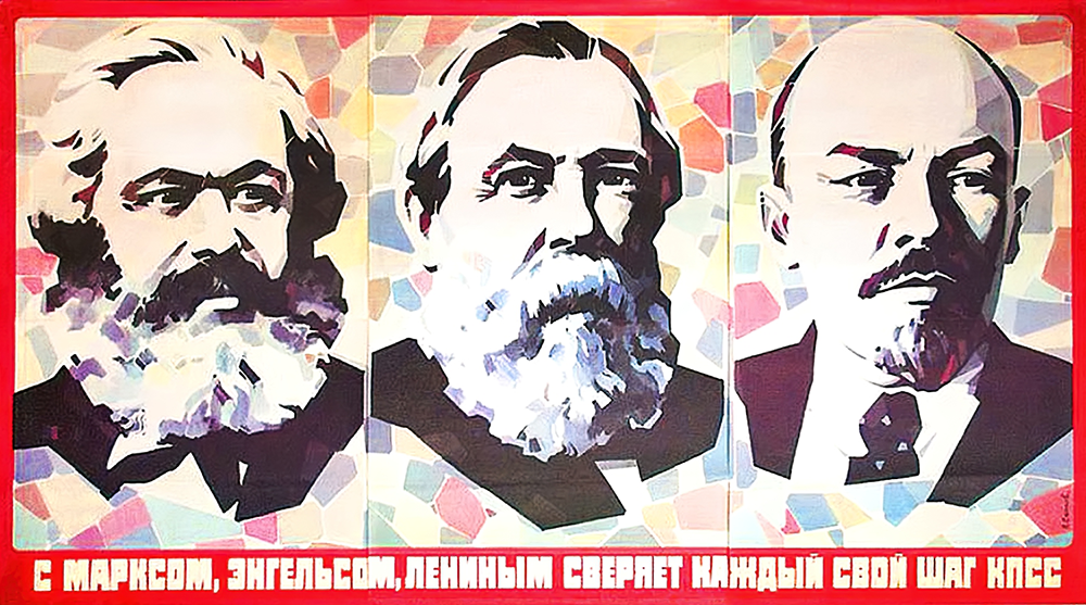 This poster's caption explains how things worked in the Union of Soviet Socialist Republics under the rule of the Communist Party. It reads "The Communist Party is checking its every step with Marx, Engels and Lenin."
