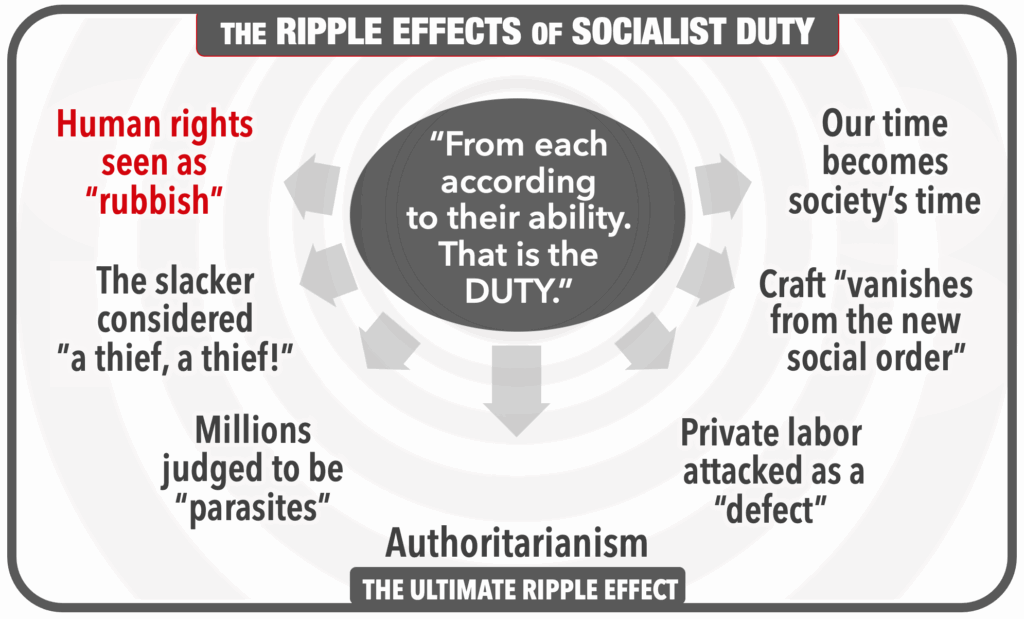 That socialism ranks duty above rights is but the first of the many ripple effects of socialism's foundation on the duty of "from each according to their ability."