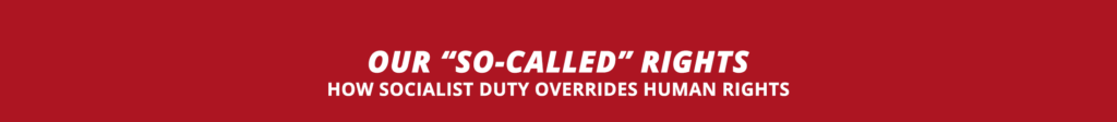 Given our inexperience with socialist duty, its incompatibility with individual rights may not be immediately apparent. At its most fundamental, a right is a freedom—the power to choose for yourself what you will do and when you will do it. By contrast, a duty is something imposed by the power of another. A duty voids freedom. It compels you to act and tells you how you must act.